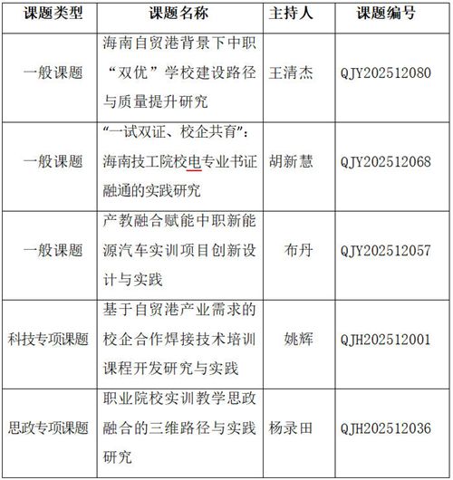 本次获批立项的课题聚焦产教融合、书证融通等职教改革核心,关注新技术在实训教学中的应用,紧扣海南自贸港产业升级与职业教育高质量发展需求,彰显了学院以科研驱动教学改革、服务自贸港技能人才培养的扎实成效。